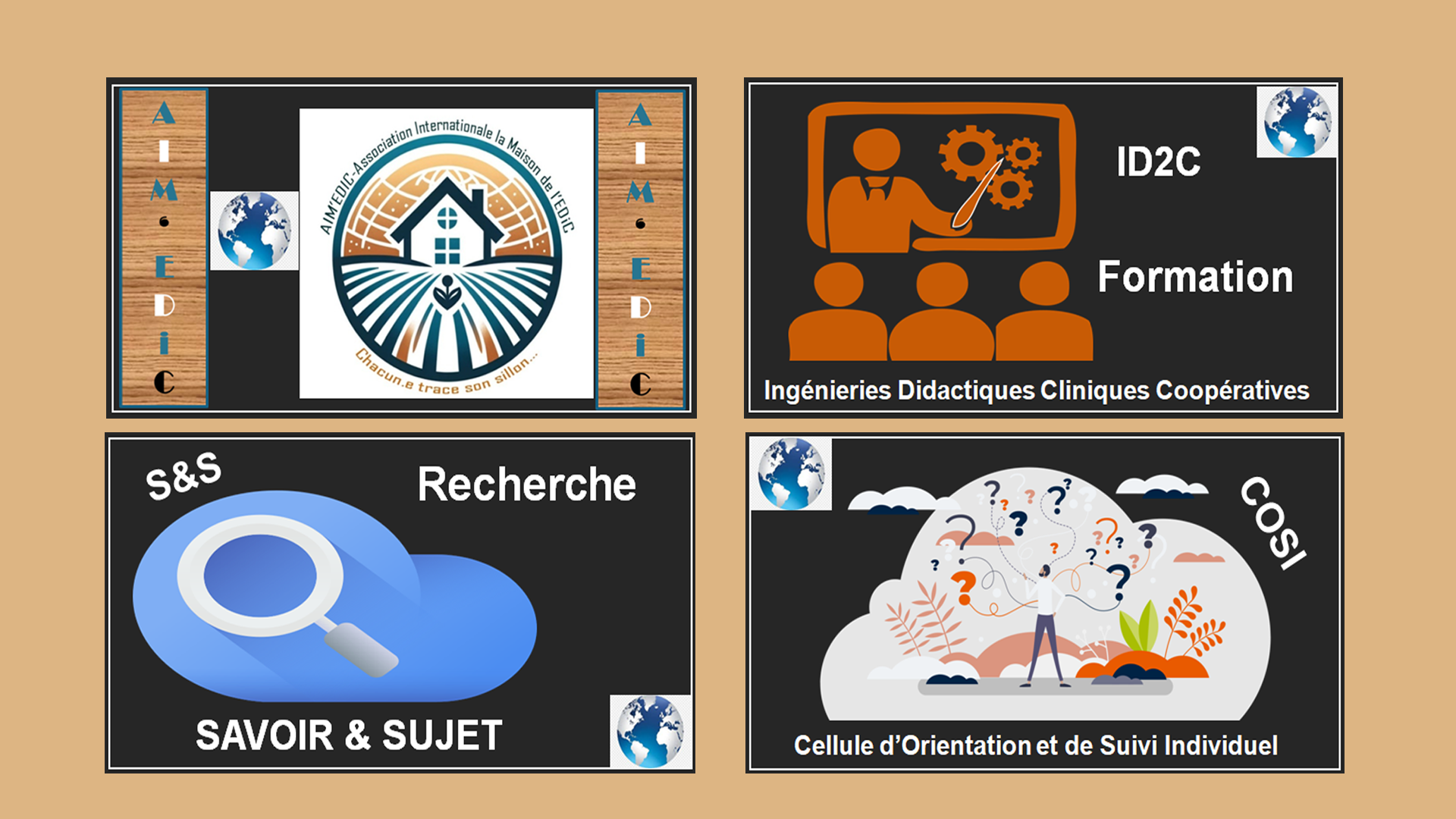 AIM’EDiC (Association Internationale « La Maison de l’EDiC ») est une association loi 1901 à but non lucratif, à vocation d’utilité publique et d’intérêt collectif, fondée sur une éthique coopérative et centrée sur le Sujet. Elle est attachée aux valeurs du service public d’enseignement, d’éducation, de formation, d’orientation, et plus largement des métiers du lien.